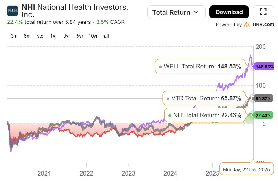 NHI is small relative to industry bellwethers Welltower and Ventas and could prove to be a good bolt-on acquisition for them. Its stock has lagged both companies since pre-pandemic, and I can think of one quick way to help close that gap.